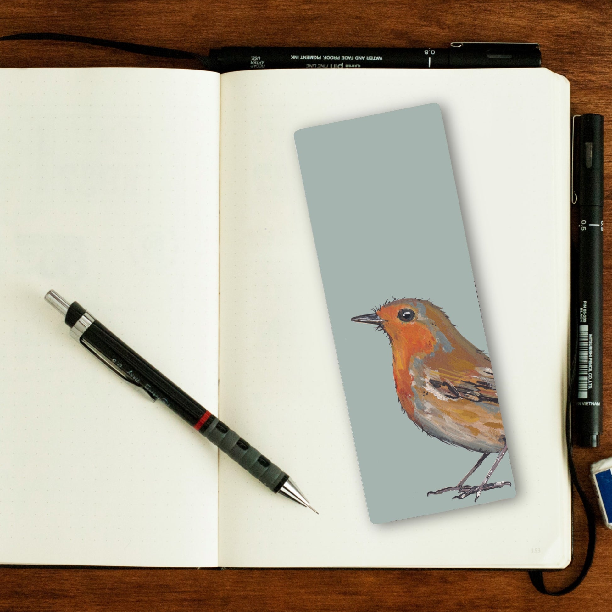 This eco friendly bookmark features my original painting of Barnacle the Robin.