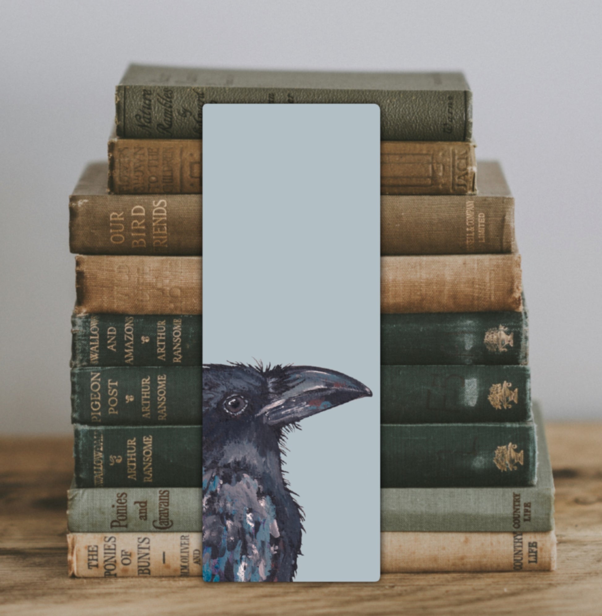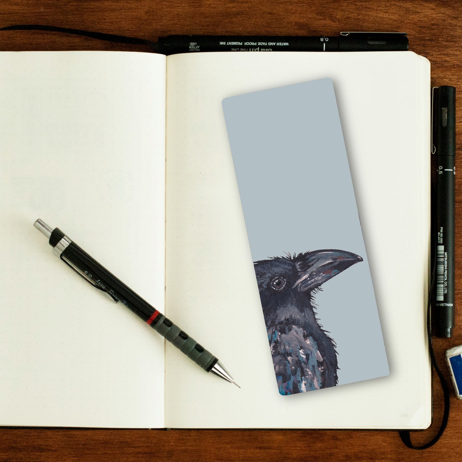 This eco friendly bookmark features my original painting of Fancypants the Raven.
