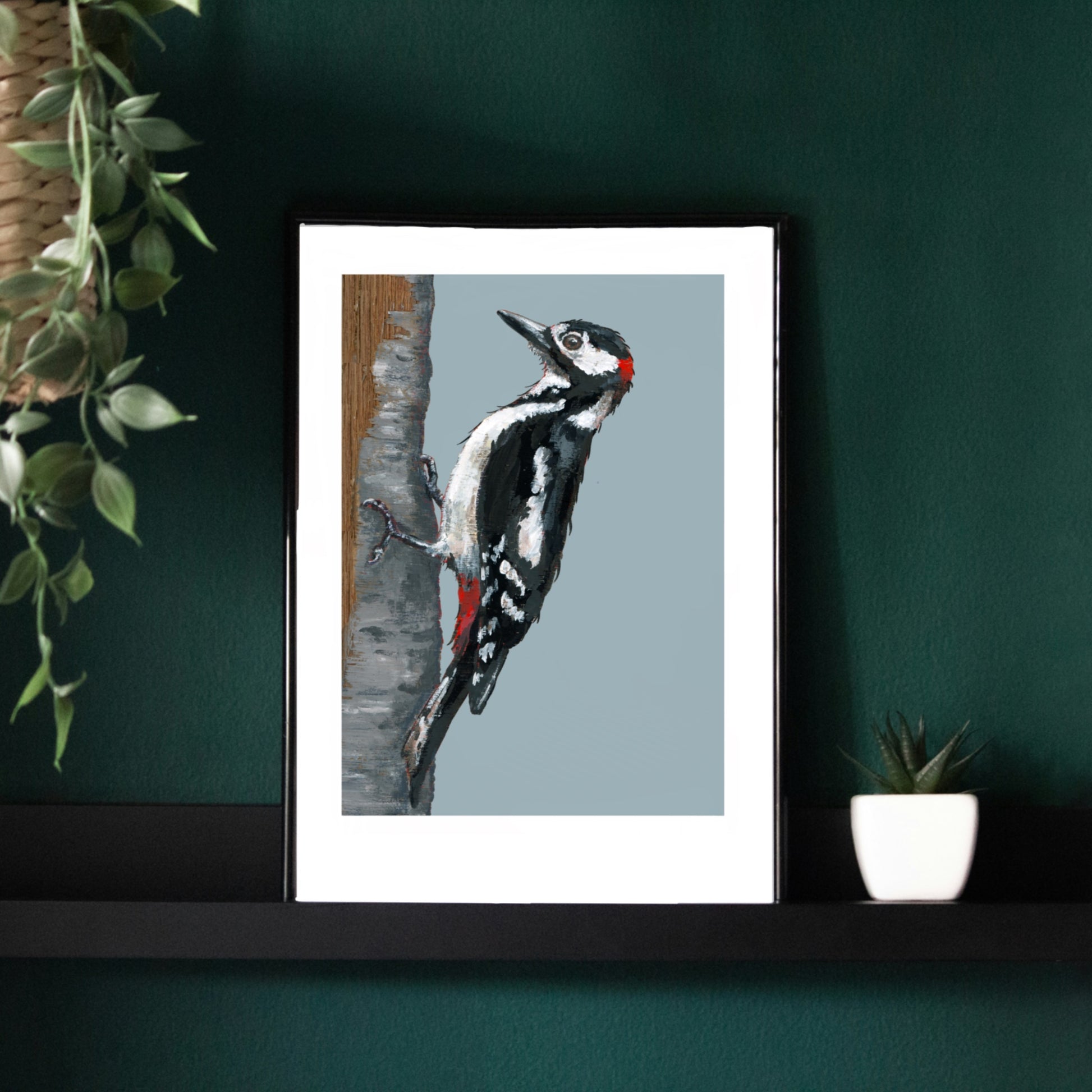 Eco friendly art print of my original painting Fluffy the Woodpecker