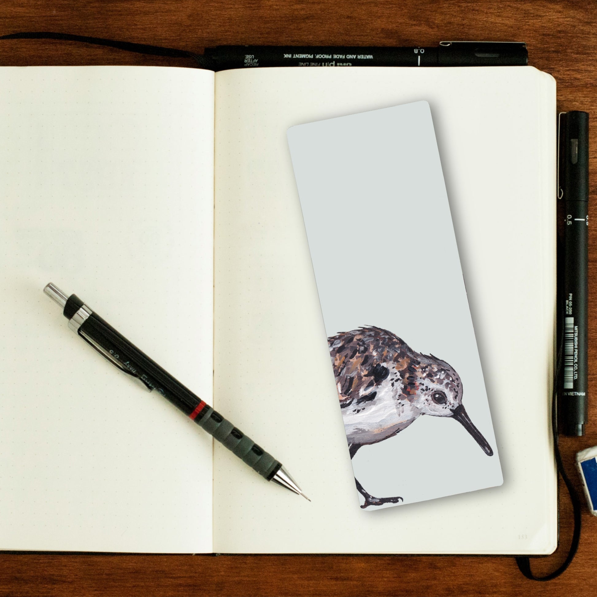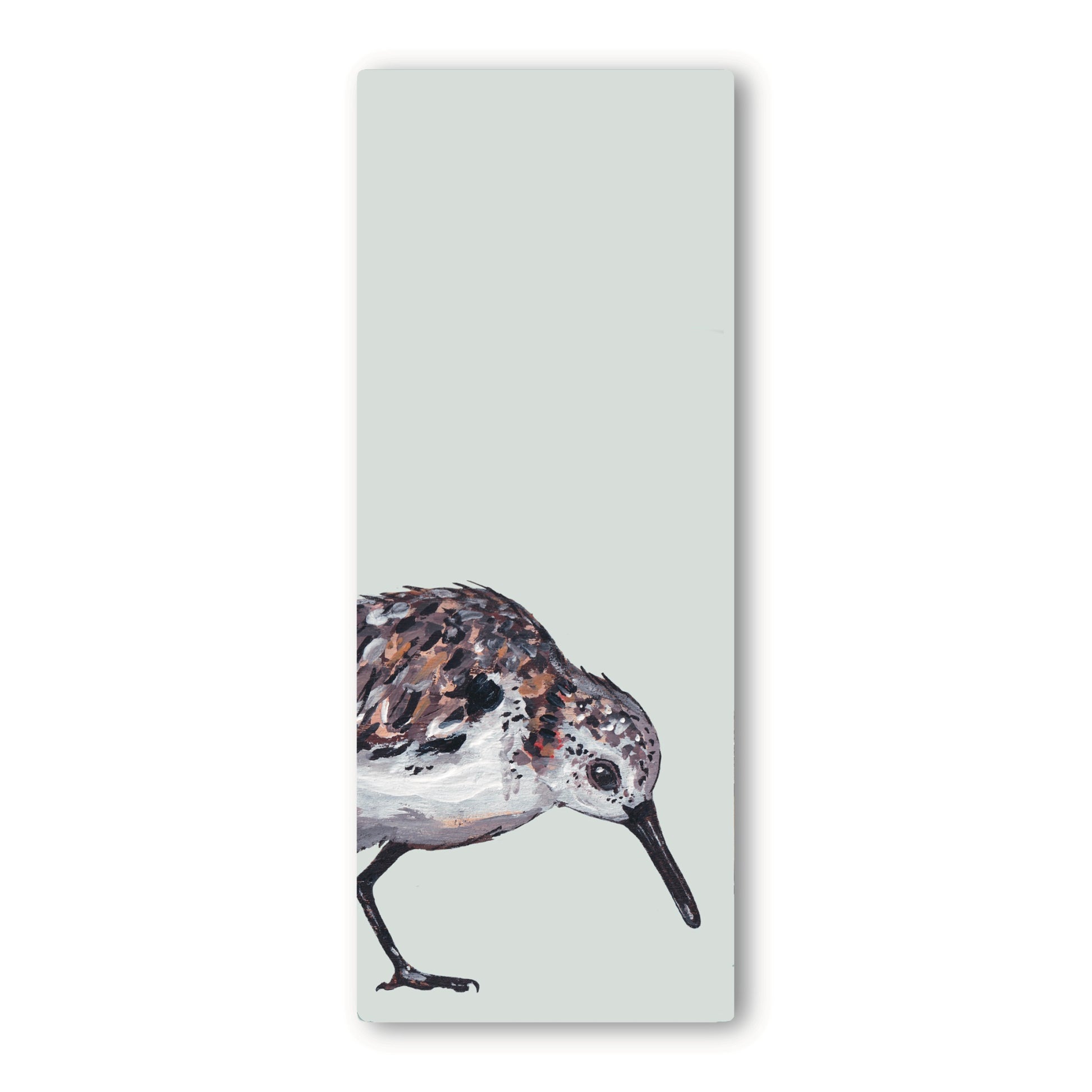 This eco friendly bookmark features my original painting of Mrs D the Sanderling.